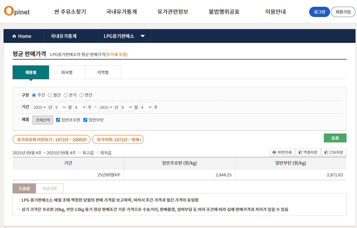 - ‘제품별·지역별’ 평균 보기: 오피넷 ‘LPG용기판매소의 평균 판매가격’에서 기간과 제품을 선택해 조회합니다.