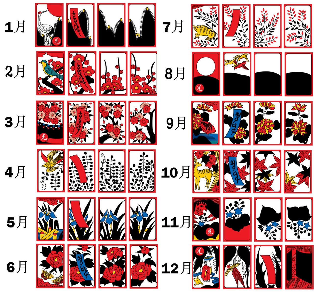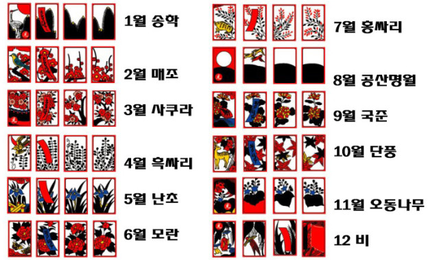 - 1월 송학광, 3월 벚꽃광, 8월 달광, 11월 비광, 12월 똥광(비싼 광)