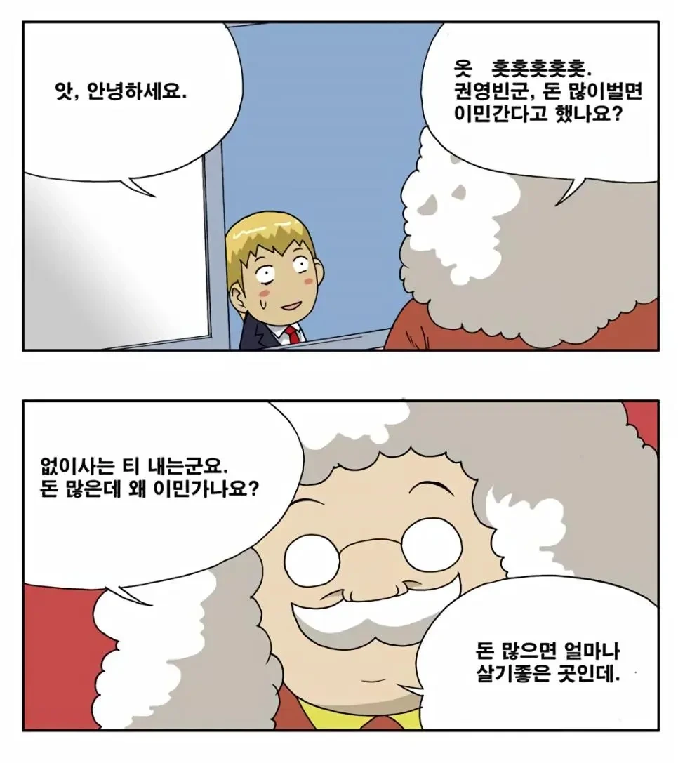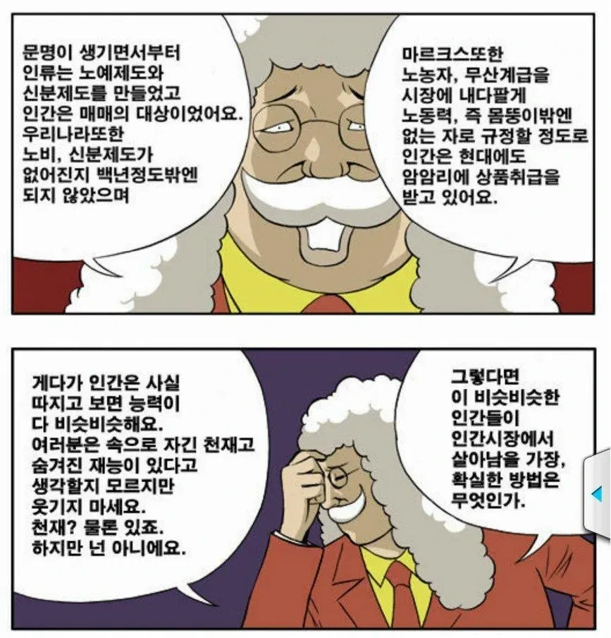 다음으로 등장한 꼰대는 "인류는 문명이 생겨난 이후로 끊임없이 신분과 계층을 만들어 왔다"며 현대 사회에서도 마찬가지로 사람들은 자신의 노동력을 상품처럼 내다 팔고 있다고 말합니다. 이러한 이야기는 마르크스의 노동자와 자본가의 관계와 크게 다르지 않습니다. 이 꼰대의 시각은 우리가 현재 속한 사회 구조의 본질을 직시하게 만듭니다. 이는 우리에게 경제적 독립의 필요성을 환기시키며, 개인으로서 자신의 가치를 높이기 위해 지속적인 노력이 필요하다는 것을 상기시켜줍니다.