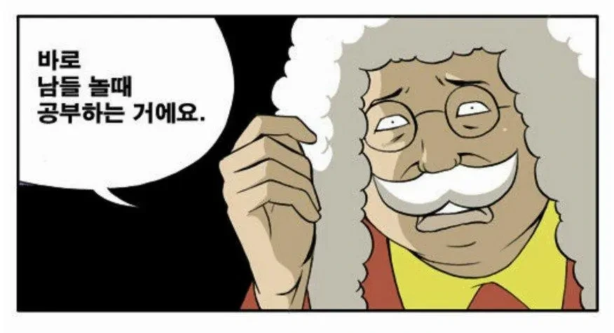 이미지 속 주인공이 "남들 놀 때 공부하는 거에요"라고 말하는 장면은 흔한 꼰대의 전형적인 조언처럼 들립니다. 하지만 그만큼 진리이기도 합니다. 모두가 쉬고 즐길 때 한 발 앞서 나가려면 그 시간을 공부나 자기 계발에 투자해야 한다는 의미입니다. 결국 사람들은 경쟁 속에서 성과를 만들어내고 그 성과를 바탕으로 사회적 위치를 잡아가게 됩니다. 남들이 쉴 때 나 자신을 위해 투자하는 시간은 후에 큰 결실을 맺게 됩니다.