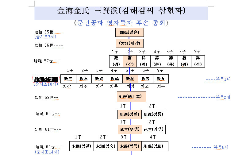 김해김씨 항렬표 삼현파·경파·감무공파·판서공파 항렬자 정리