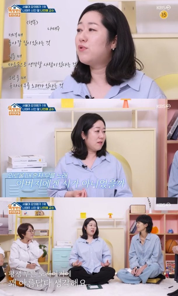최근 KBS2 ‘옥탑방의 문제아들(옥문아)’에 출연한 나민애 교수는 방송 직후부터 화제를 모았습니다. 그녀는 서울대학교에서 10년 넘게 글쓰기를 가르쳐 온 문학평론가이자 교육자이며, 동시에 대한민국을 대표하는 서정시인 나태주의 딸로 알려져 있습니다. 방송에서 공개된 그녀의 학창 시절 이야기와 가족 간의 따뜻한 일화는 대중에게 강한 인상을 남겼습니다.