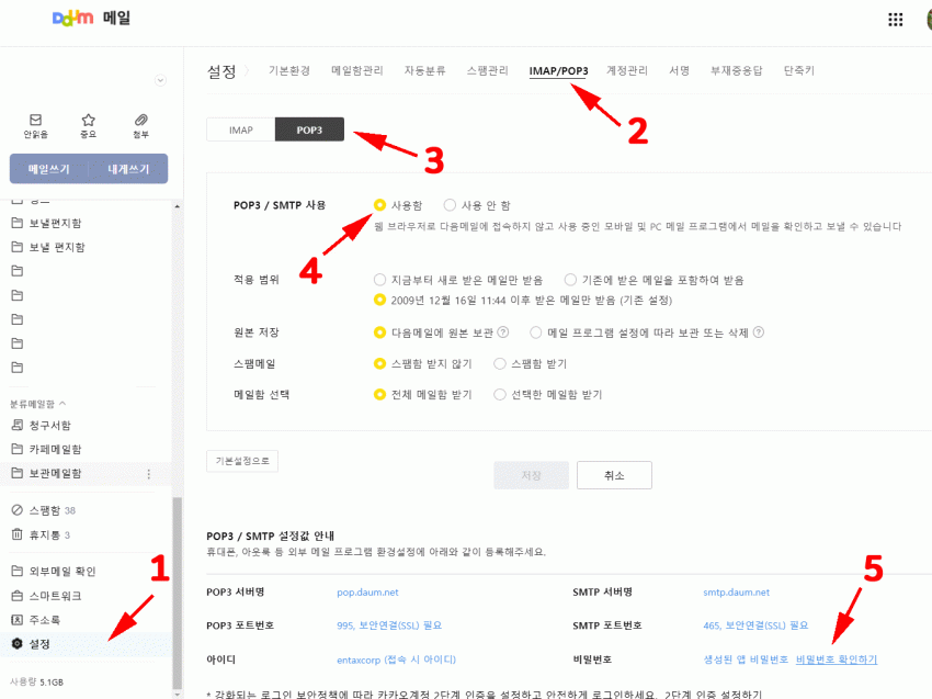 abc@hanmail.net) - 수신 메일 서버(IMAP):
