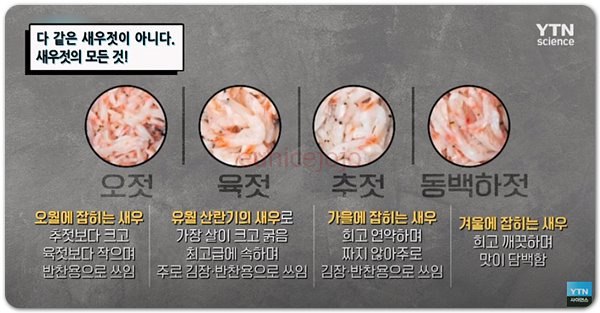 • 춘젓(봄): 3~4월경 봄철에 잡은 새우로 담근 젓으로, 새우 크기가 작고 육질이 연해 나물이나 찌개용으로 적합합니다.