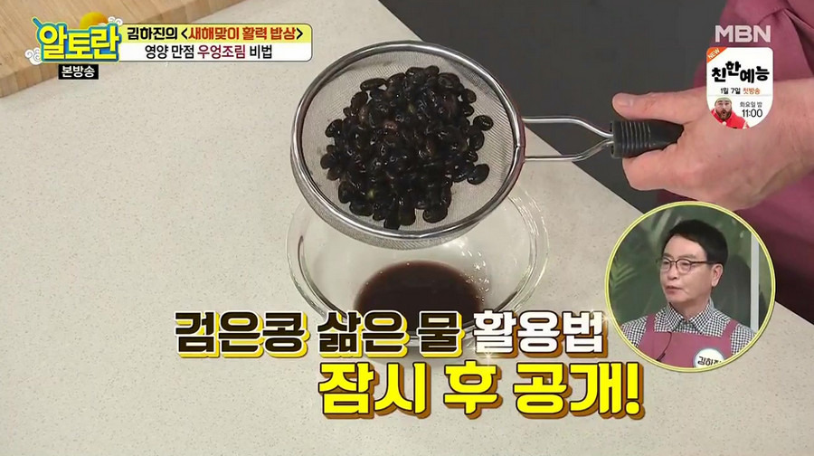 이때 너무 오래 삶으면 콩이 으깨지므로 주의해야 합니다. 다 삶은 콩은 체에 걸러 콩과 삶은 물을 따로 준비합니다. 검은콩 삶은 물은 조림장에 다시 활용하여 색과 감칠맛을 살립니다.