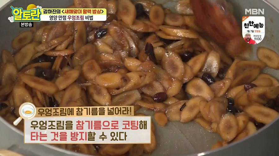 불을 끄기 직전, 참기름 3큰술을 넣어 전체를 고루 섞으면 조림에 윤기가 흐르며 코팅 효과가 생겨 타지 않습니다.