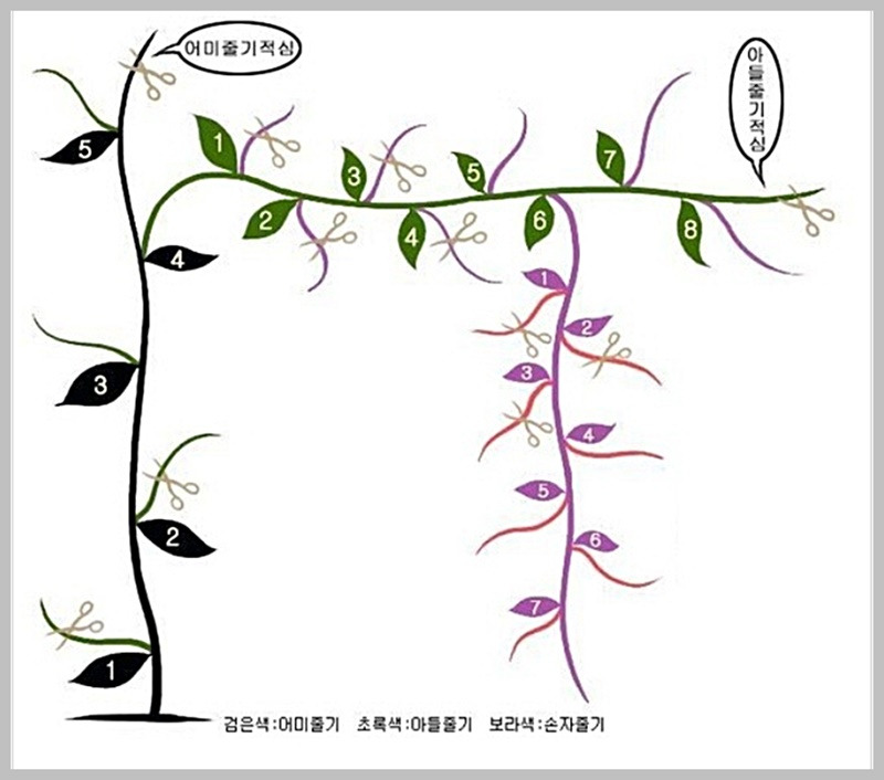 - 아들줄기의 1~4번째 곁순 제거, 5~8번째 곁순 손자줄기로 키움