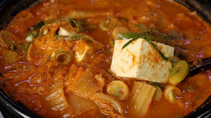 볶은 재료 위에 준비해 둔 쌀뜨물과 육수를 붓고 본격적으로 끓이기 시작합니다. 이 단계에서는 아직 청국장을 넣지 않습니다. 국물이 끓어오르면서 고기와 김치의 맛이 충분히 우러나도록 시간을 주는 것이 중요합니다. 거품이 올라오면 걷어내어 국물을 깔끔하게 유지하고, 중불에서 5분 이상 끓여 국물의 중심 맛을 완성합니다. 이 단계에서 이미 국물 맛이 어느 정도 완성되어야 이후 청국장을 넣었을 때 균형이 무너지지 않습니다.