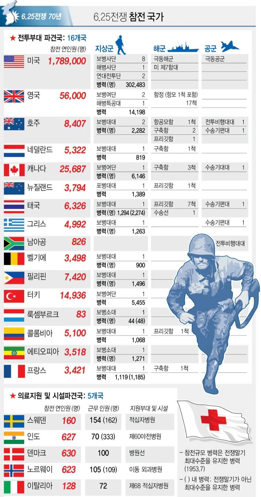 - 전통적 집계: 16개 전투국 + 5개 의료지원국 = 21개국