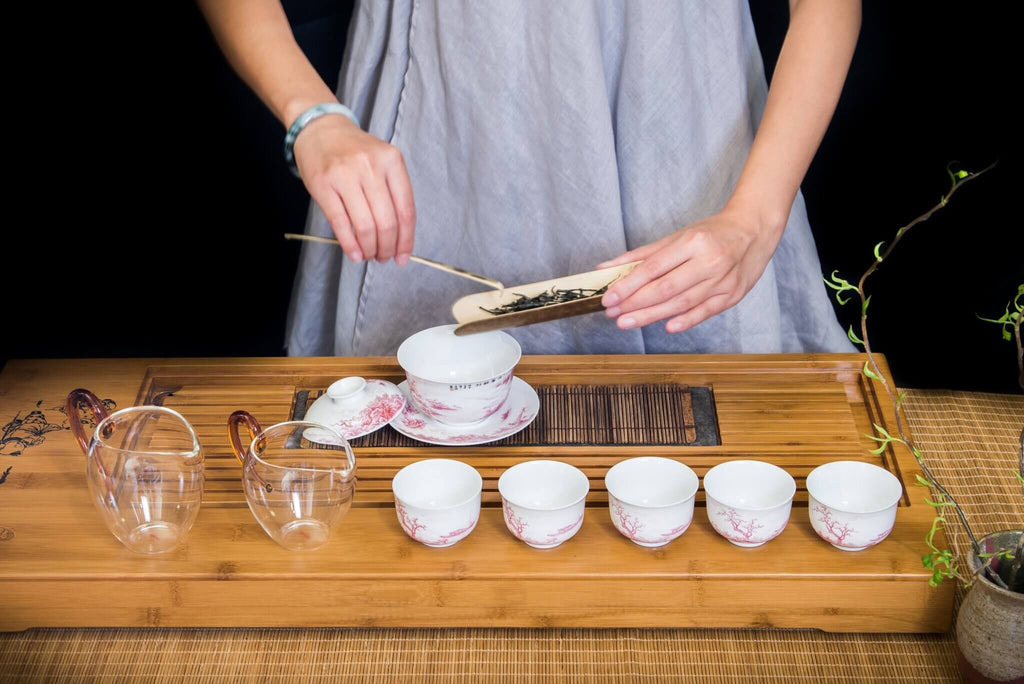- 찻주전자·가이완·공도배·잔을 뜨거운 물로 충분히 덥혀 탕의 온도 하락을 최소화합니다.