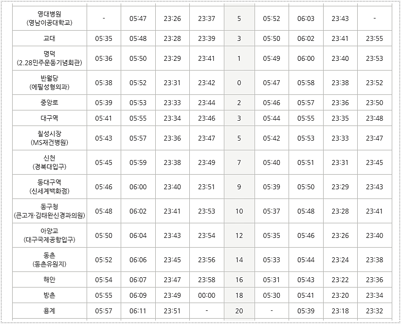 - 운행 시간대: 대체로 오전 5시대 첫차 ~ 자정 전후 막차
